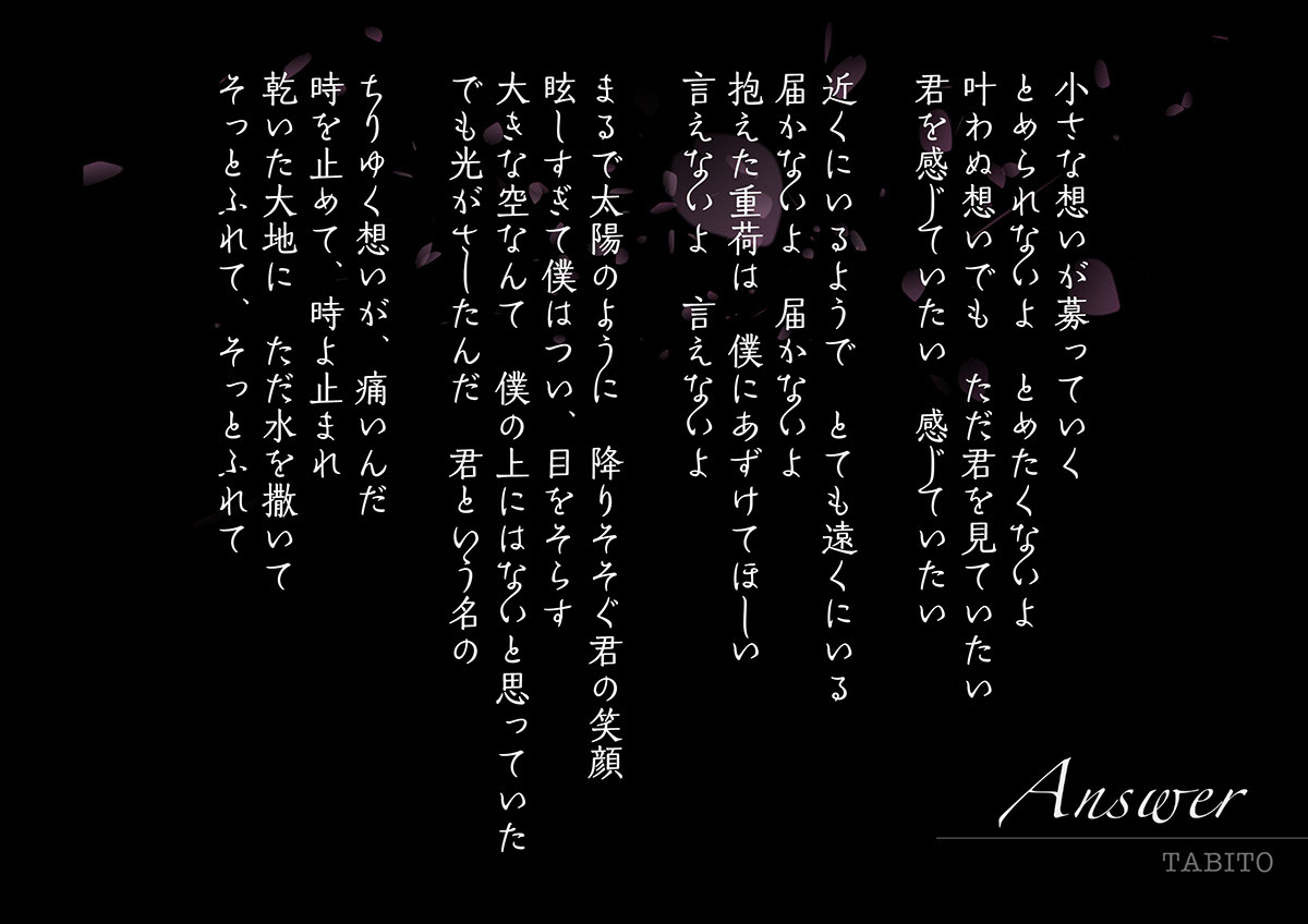 唄・作詞・作曲 TABITO / ピアノ演奏 鳥海剛史(STUDIO TORICK)/ ビデオデザイン・モーショングラフィックス TABITO